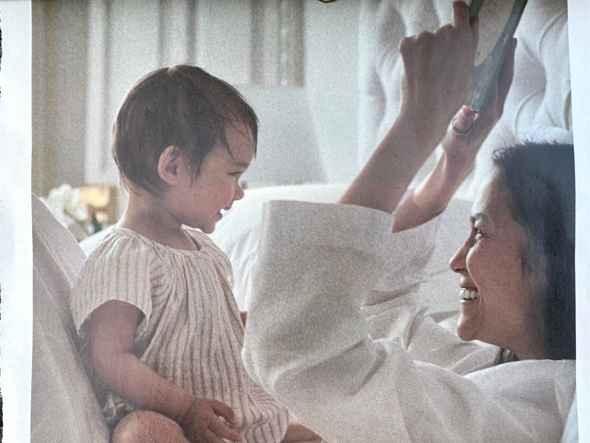 This photograph from The White Company's advertising is plainly not of a newborn, but it illustrates the trust and contentment that are generated and can be seen in a child's very early life.